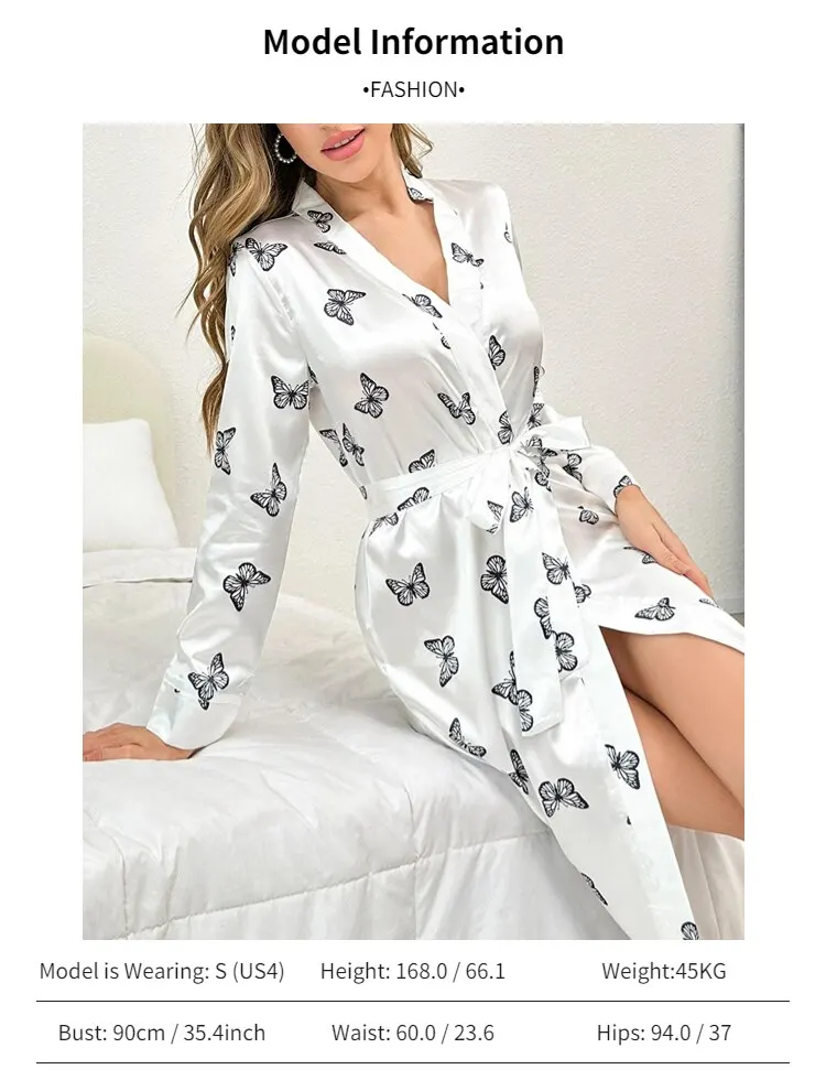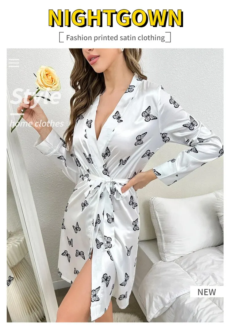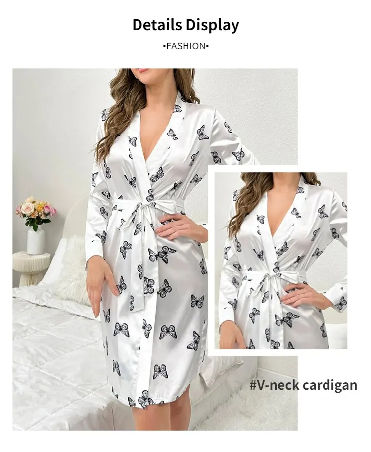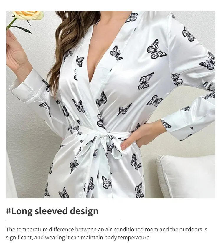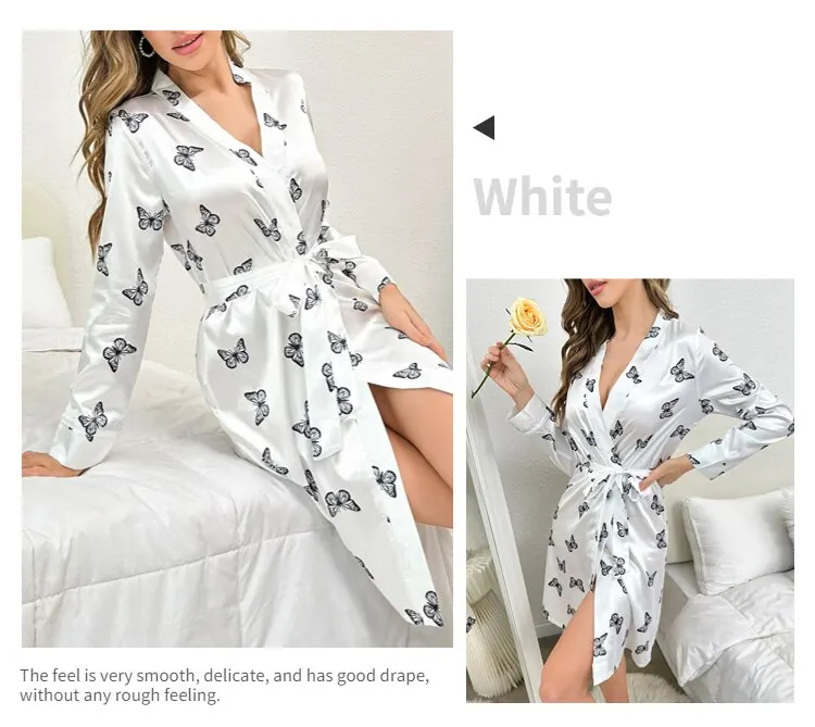 Women's Silk Robes Bride Bridesmaid Kimono Satin Bathrobe V Neck Sleepwear with Belt Long Sleeve Sleep Robe for Women