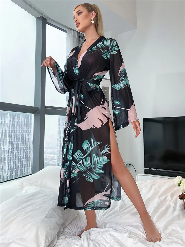 Summer Autumn Women's Bathrobe Print Belted Bridesmaid Robe Open Side Long Night Gown Mesh Nightie