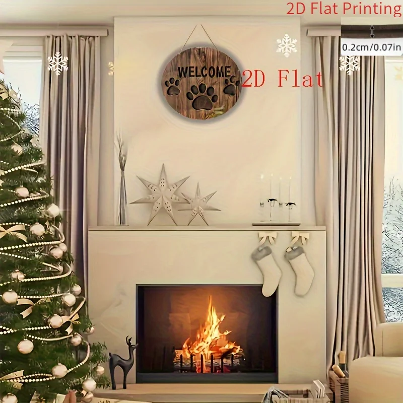 2D Flat, Farmhouse Style Round Wooden Welcome Sign with Dog Paw Print - Rustic Artificial Wood Wall Art for Home, Garden, Cafe,