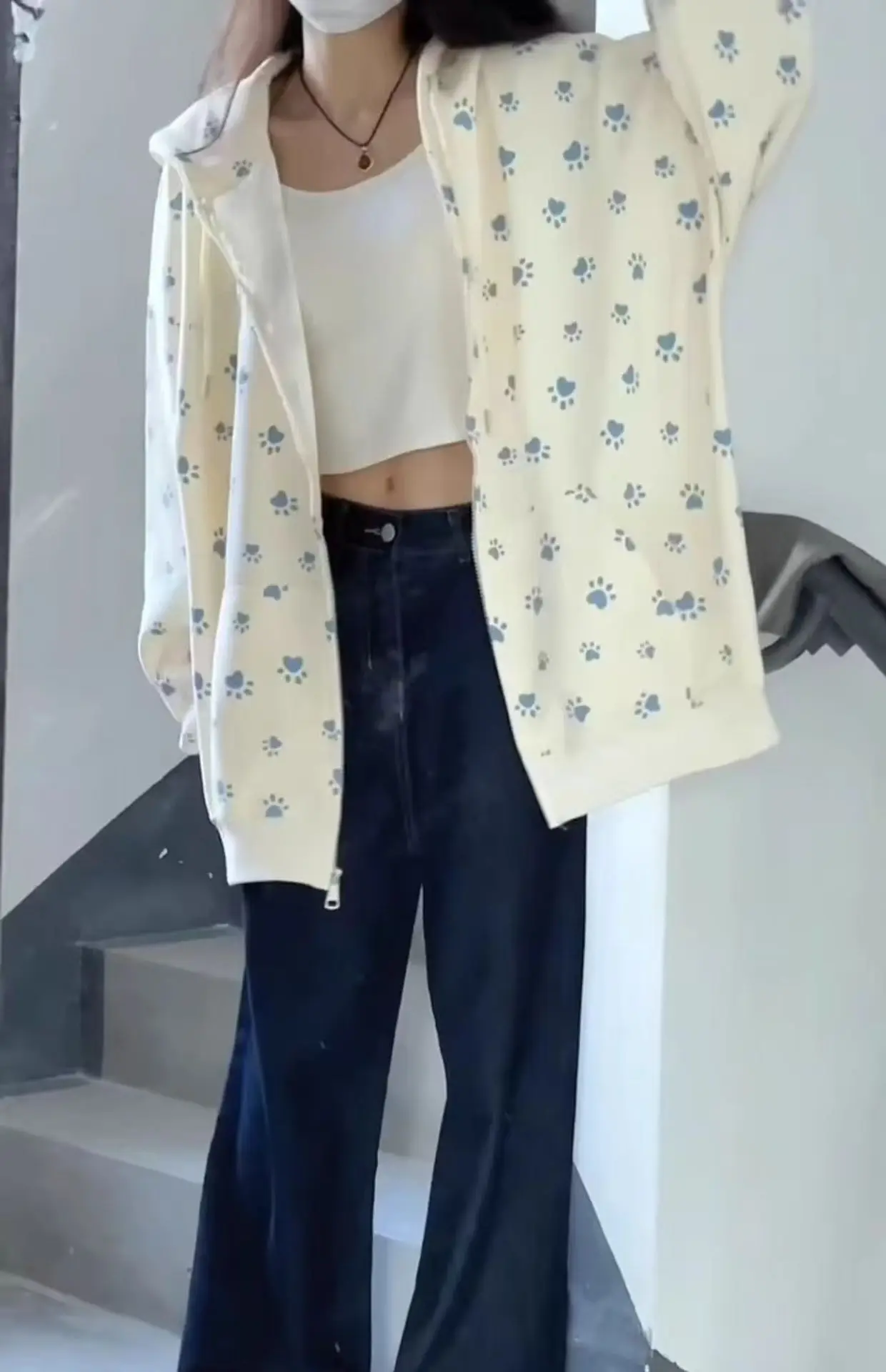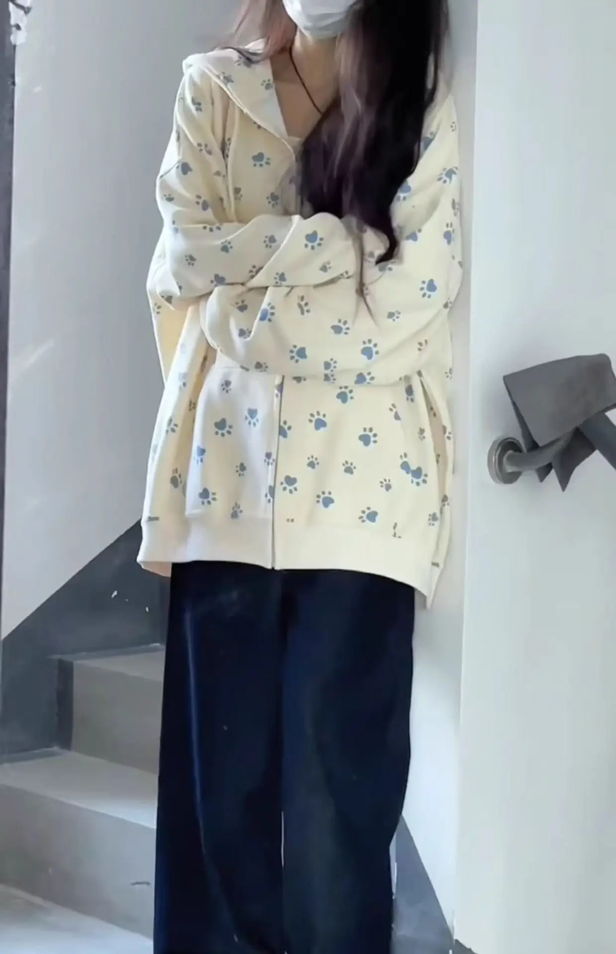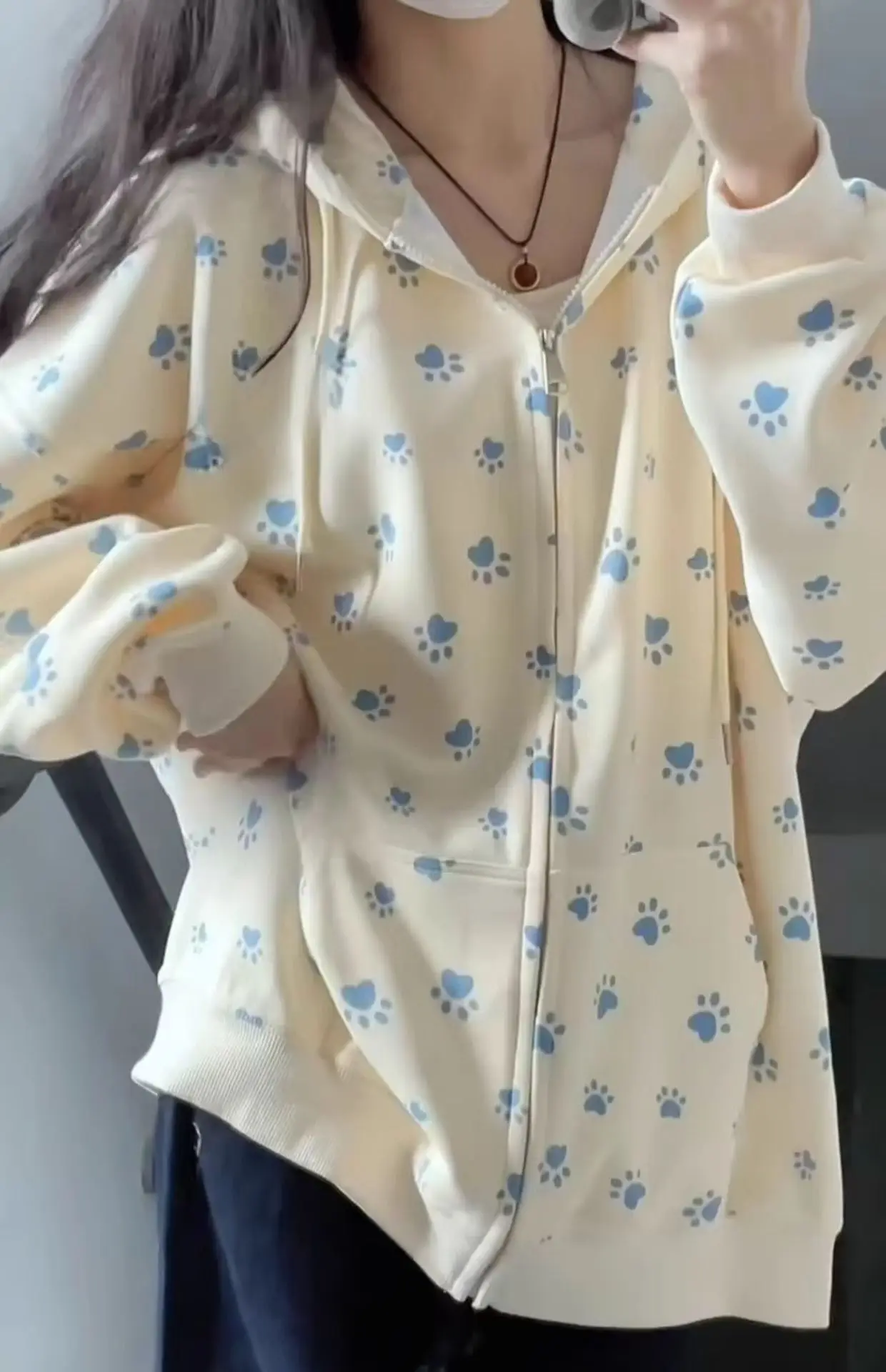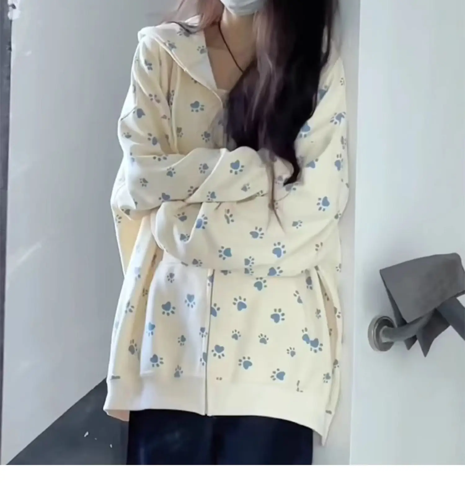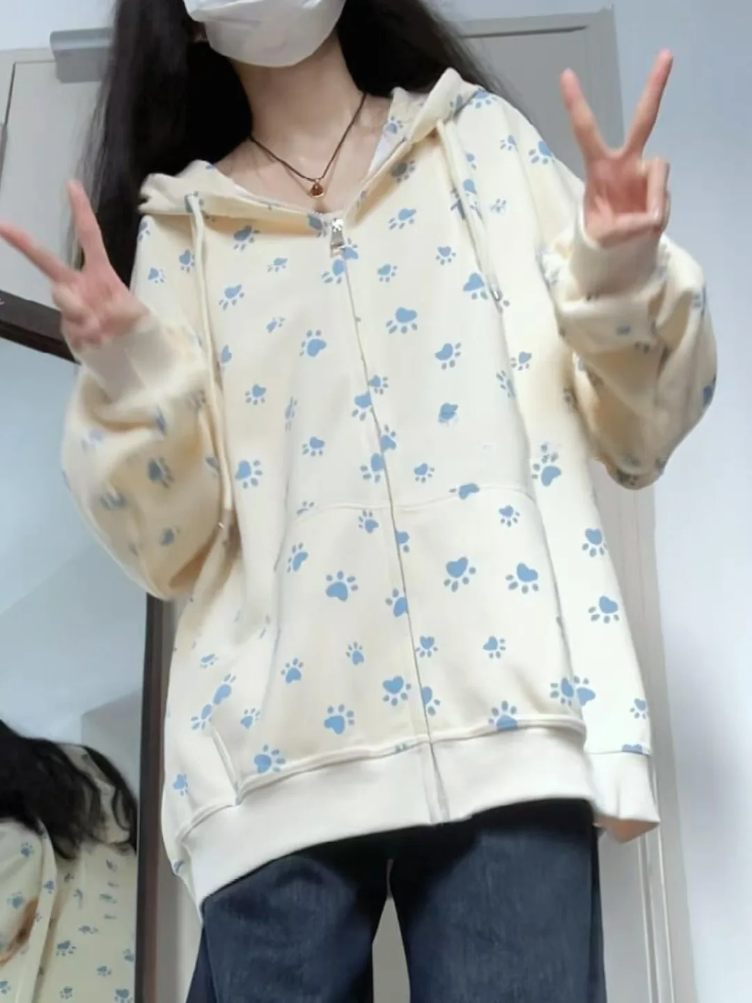 American Casual Women Hoodies Dog Paw Print Sweatshirts Loose Zipper Plush Jacket Ladies Autumn Winter Fresh Cute Coat