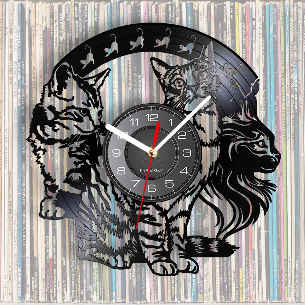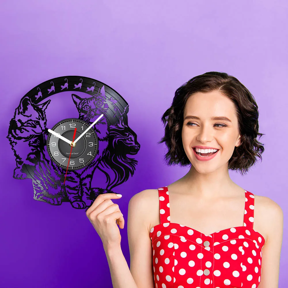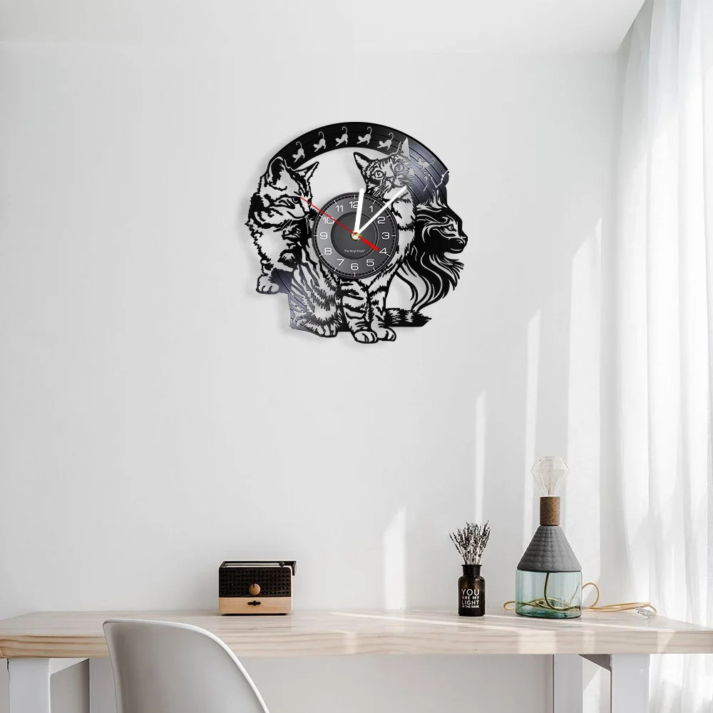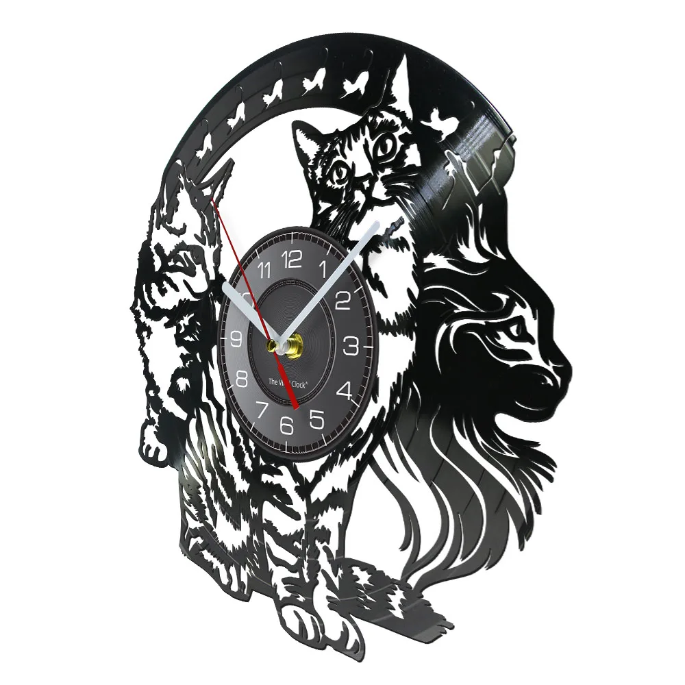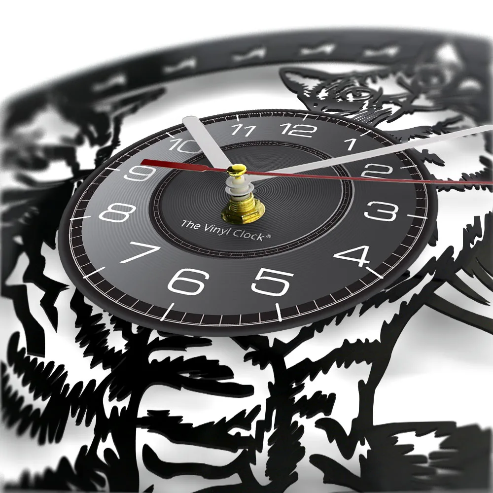 Cats Silhouette Vinyl Record Wall Clock Kitty Retro Artwork Clock Timepieces Re-purposed Vinyl Album Home Decor For Cat Lovers