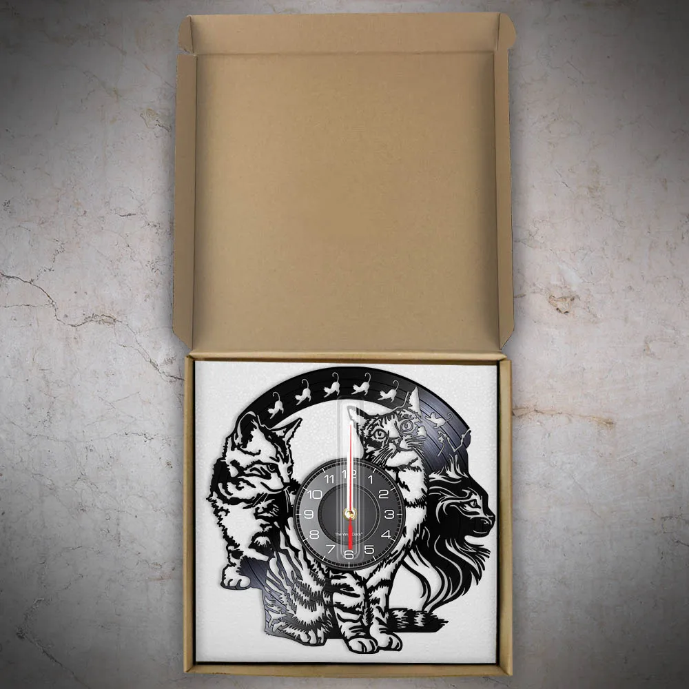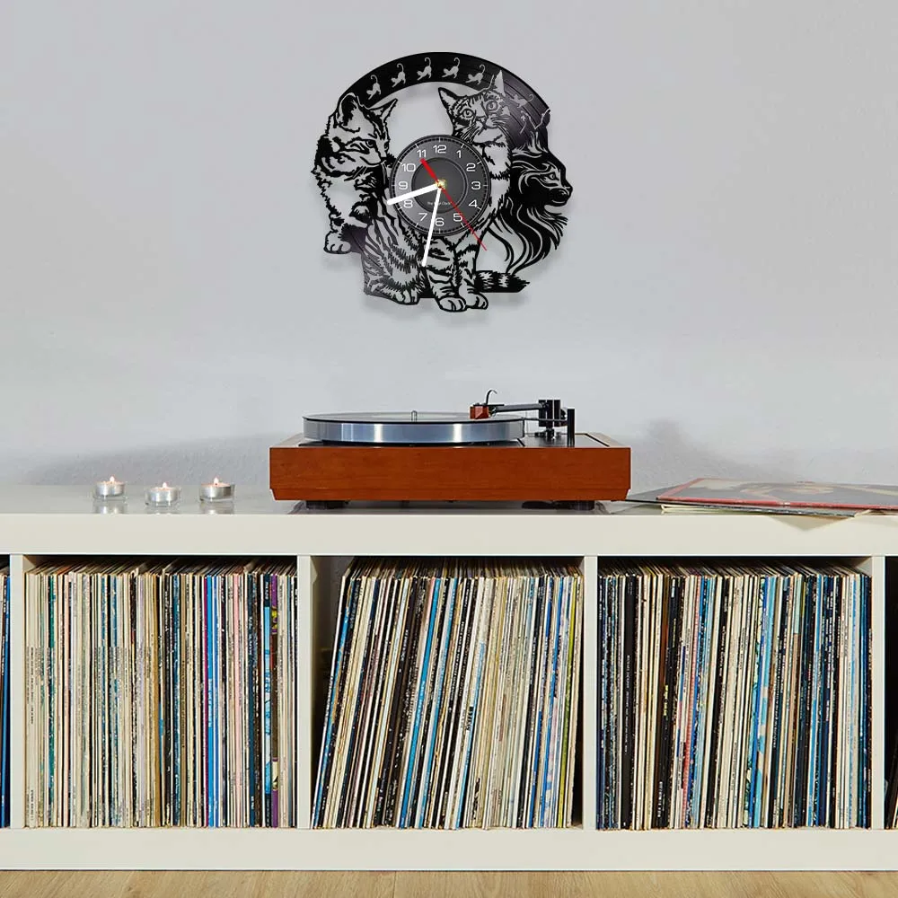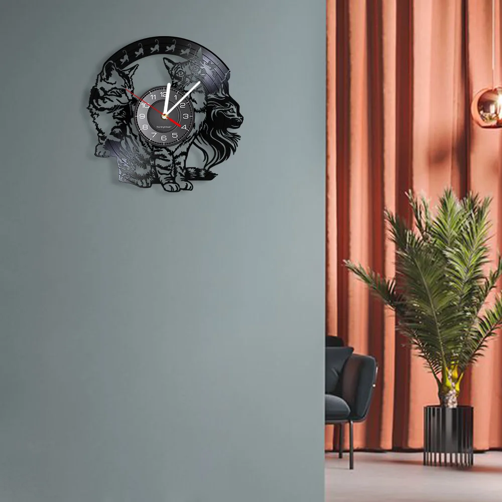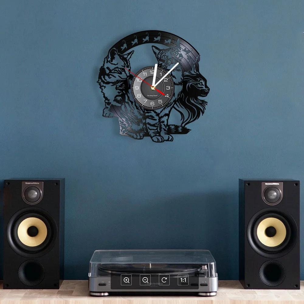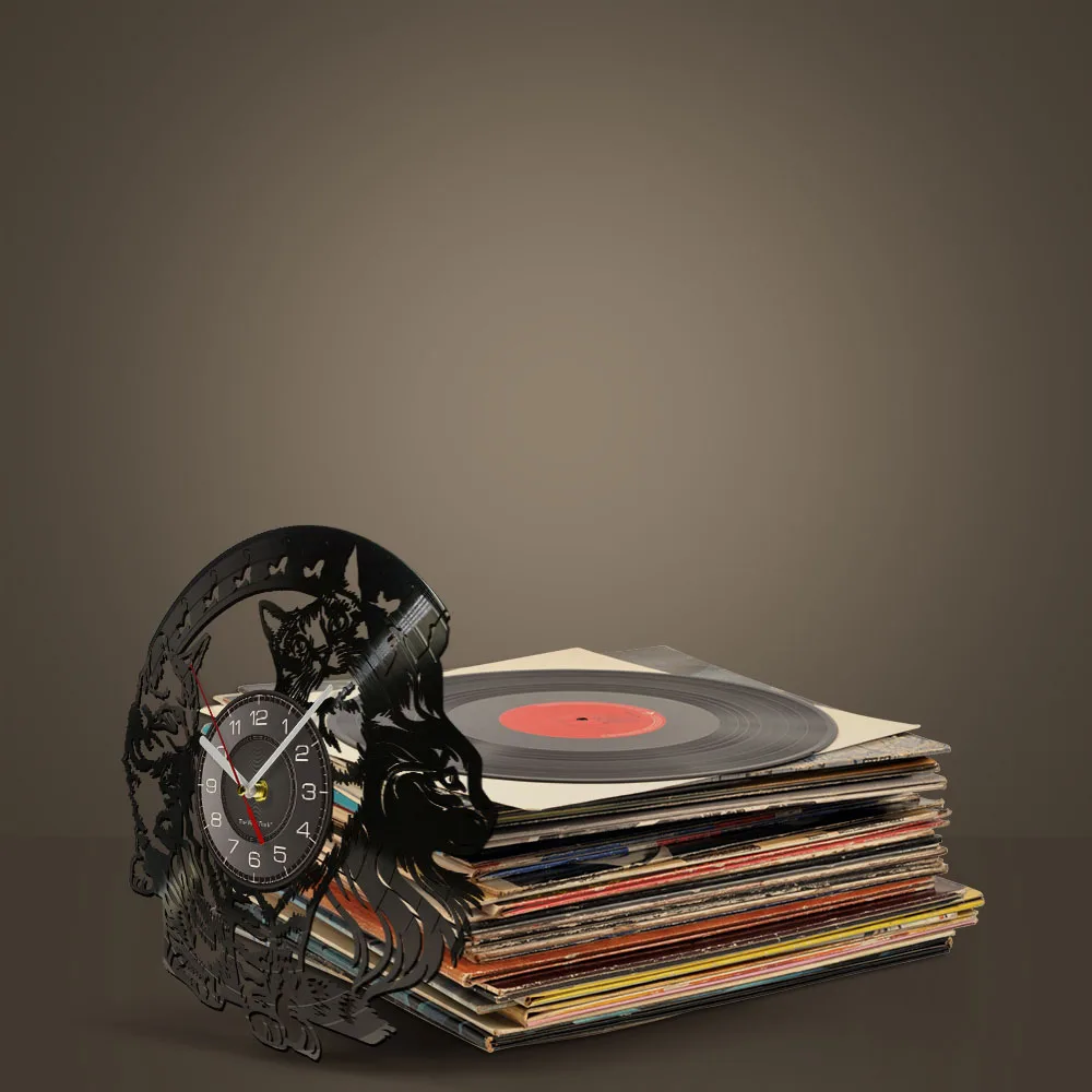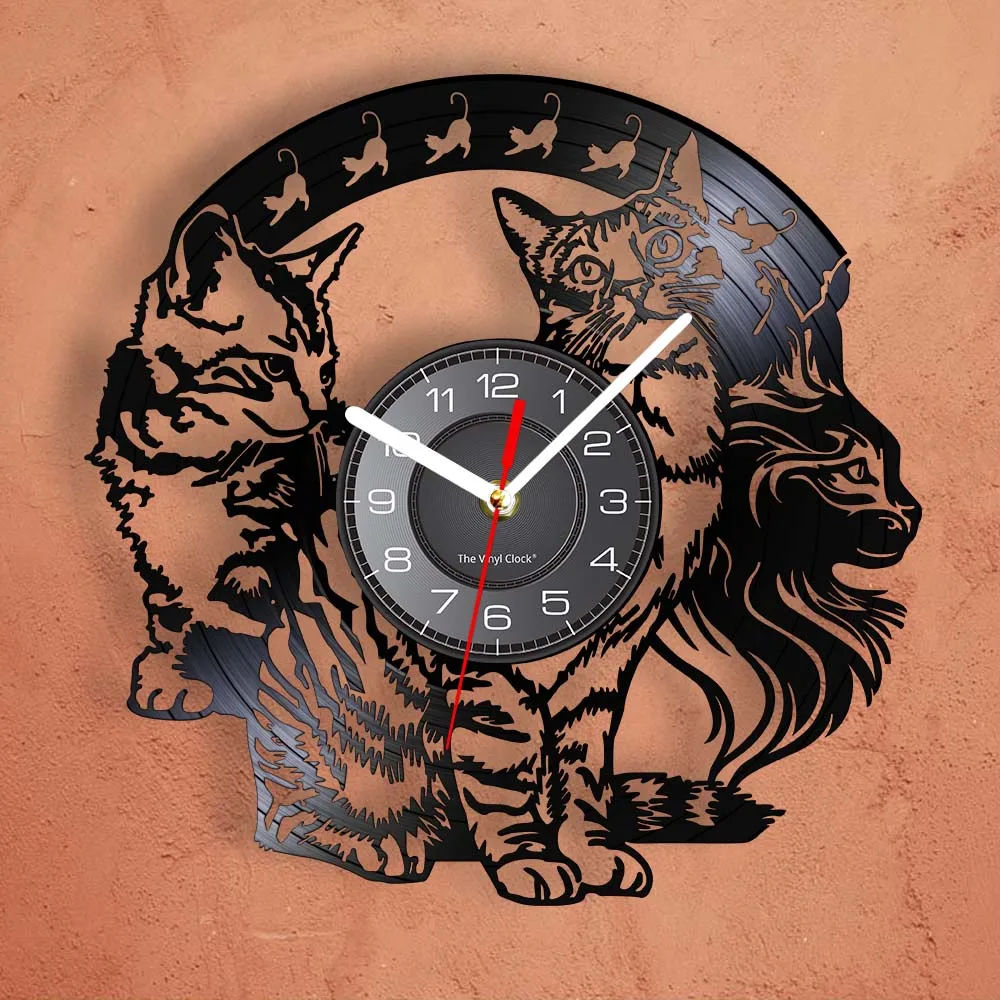 Cats Silhouette Vinyl Record Wall Clock Kitty Retro Artwork Clock Timepieces Re-purposed Vinyl Album Home Decor For Cat Lovers