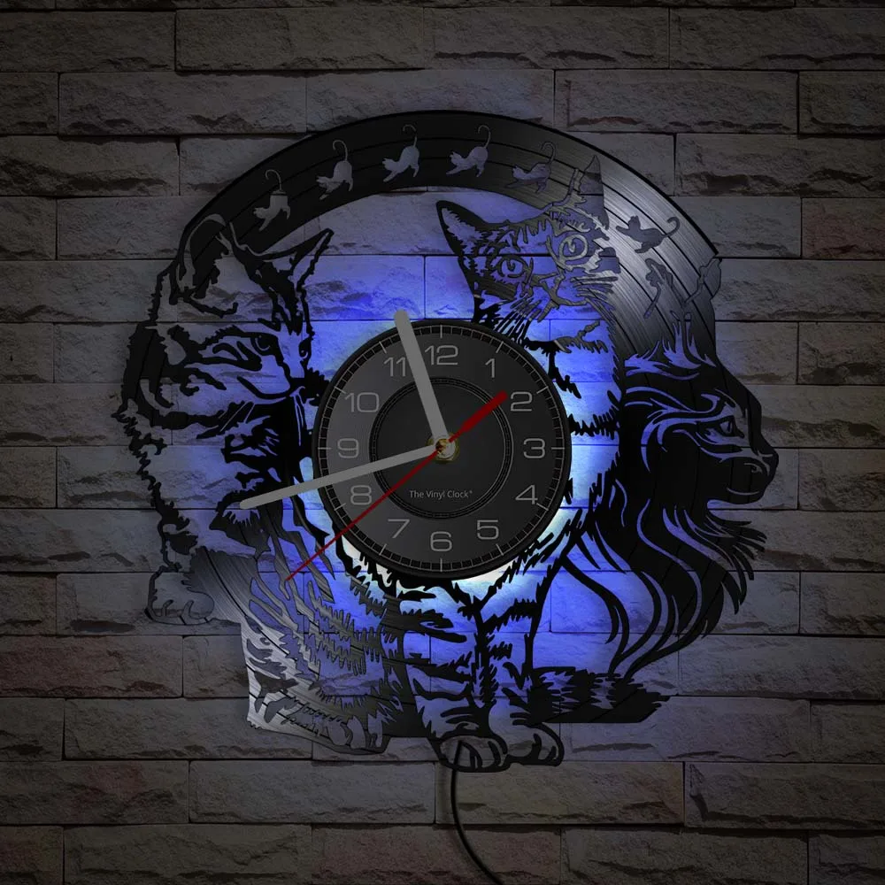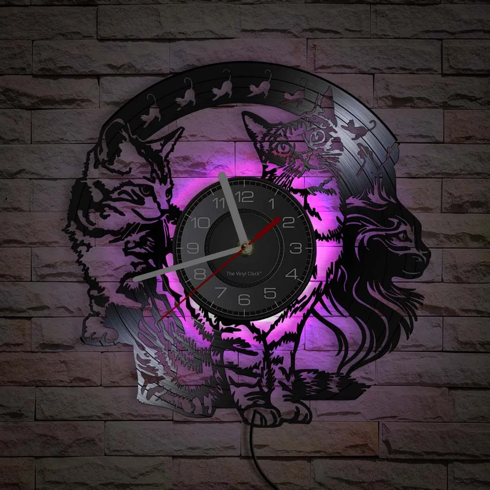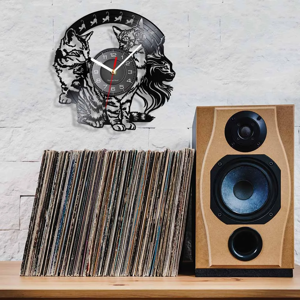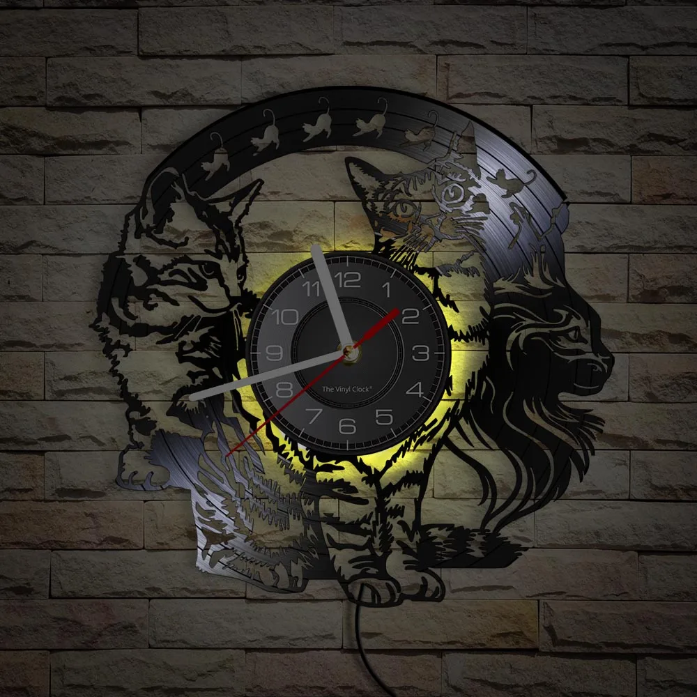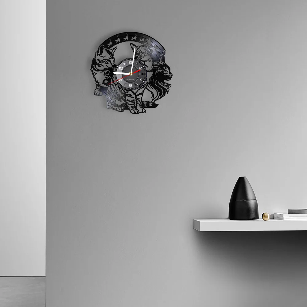Cats Silhouette Vinyl Record Wall Clock Kitty Retro Artwork Clock Timepieces Re-purposed Vinyl Album Home Decor For Cat Lovers