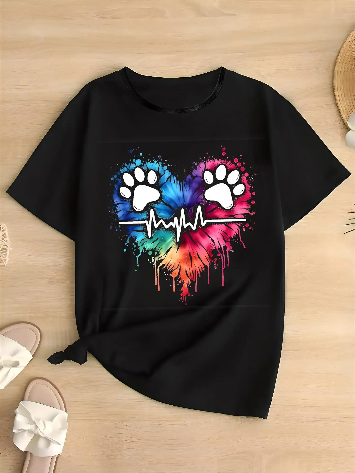 Colorful love dog paw print short-sleeved T-shirt casual and versatile style suitable for daily wear and going out in summer