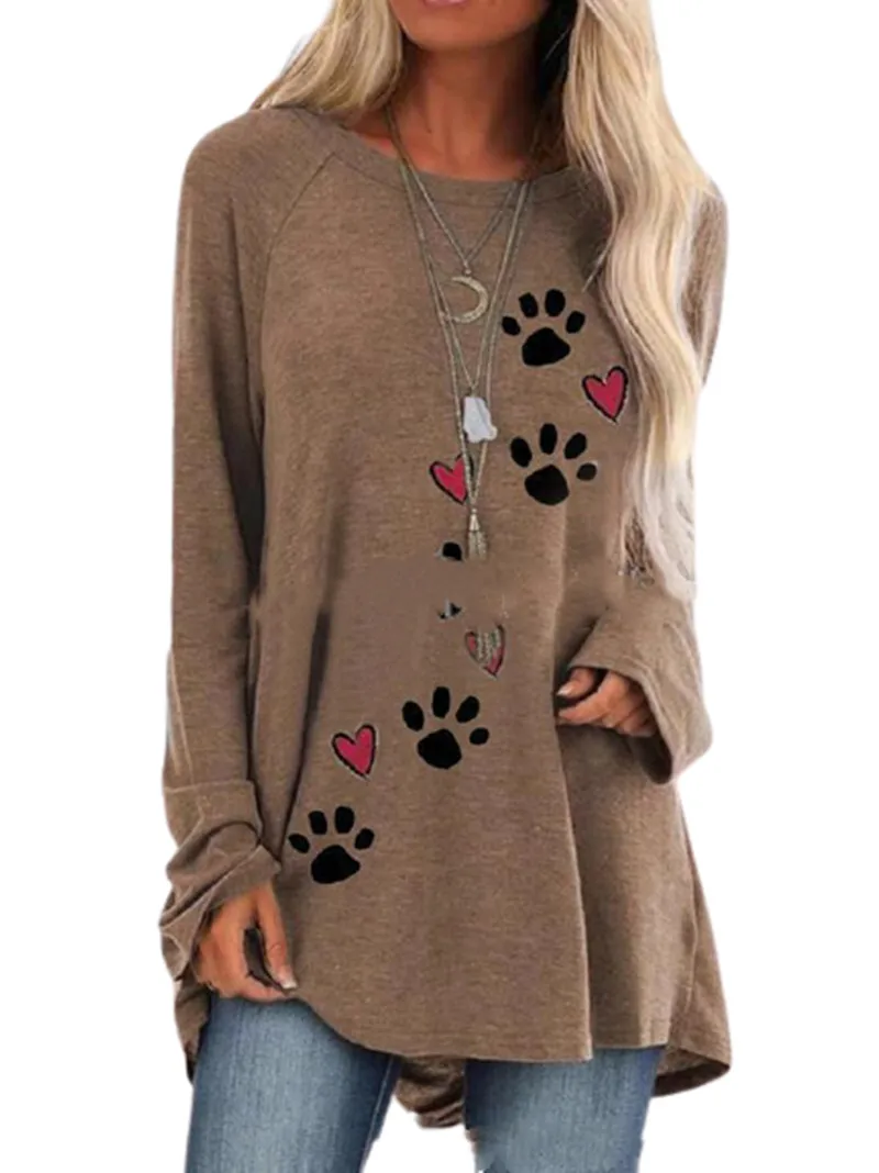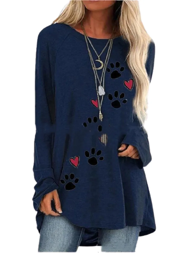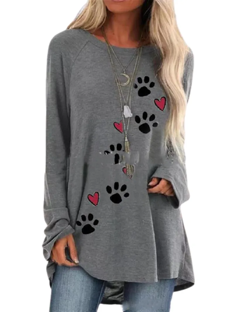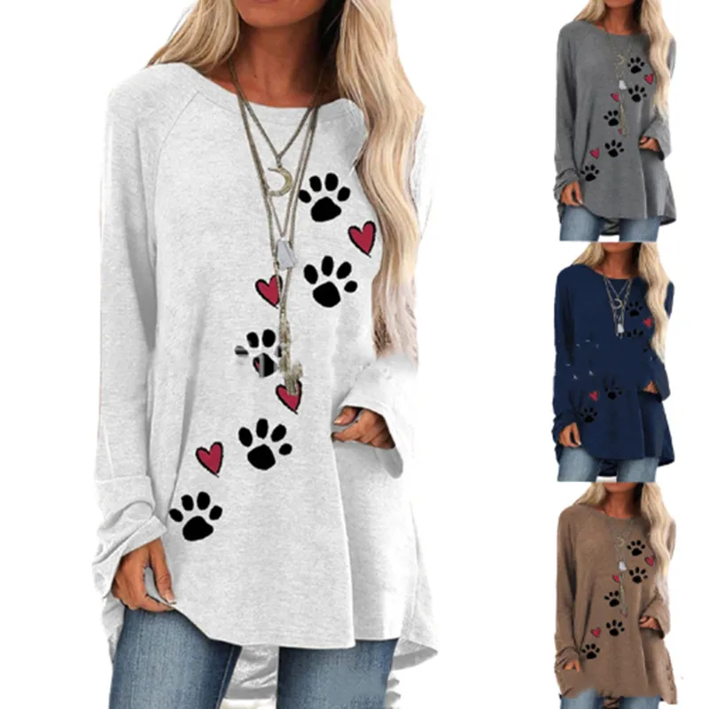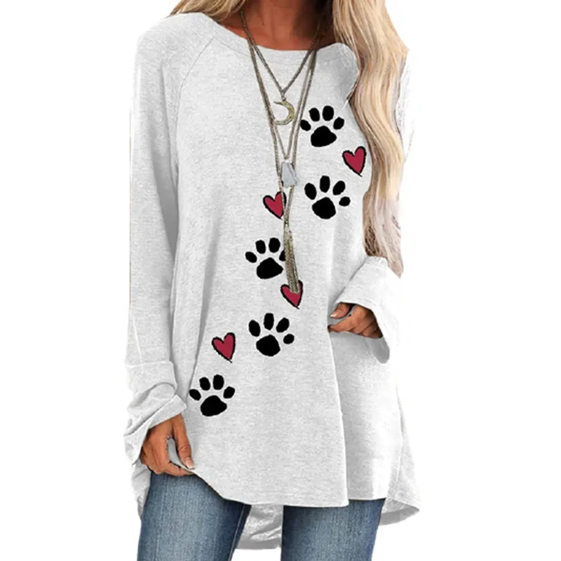 Dog Paw Print White Long T-shirts - Loose O-neck Long Sleeve Tops