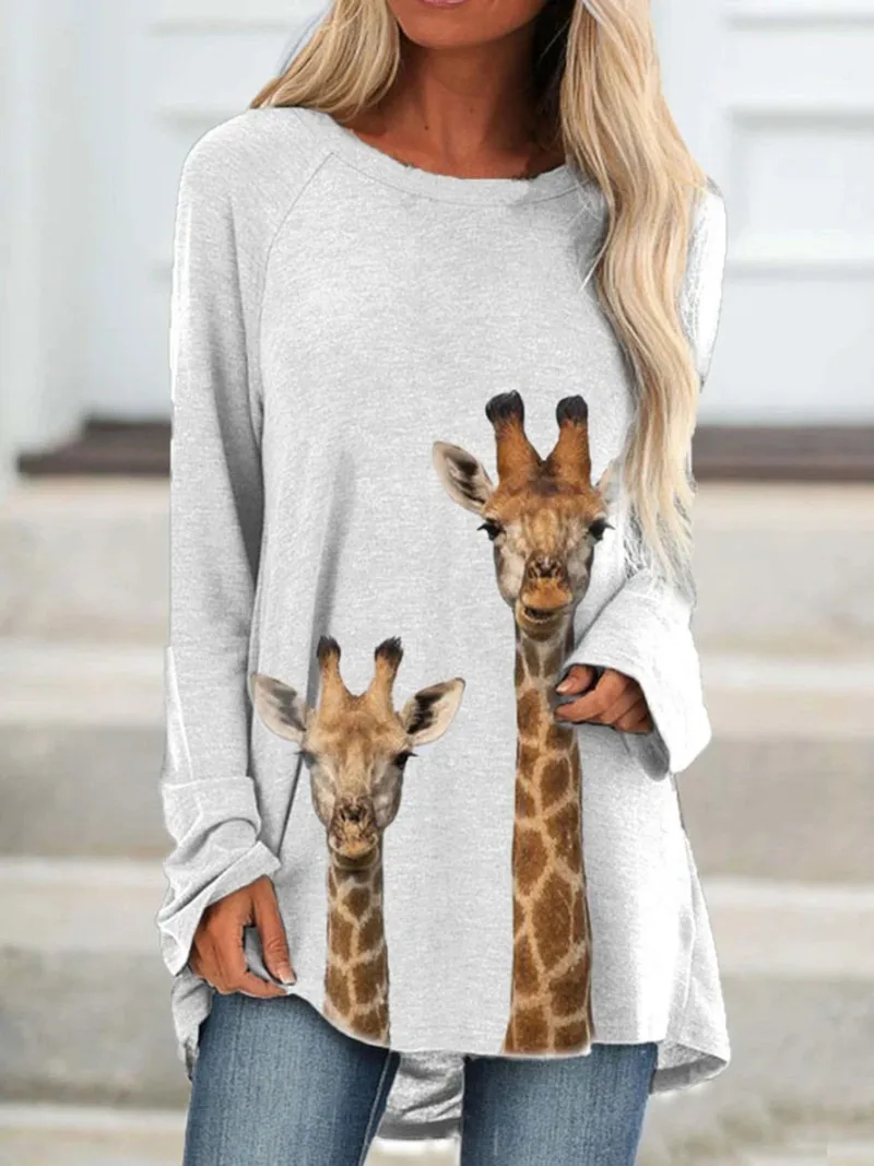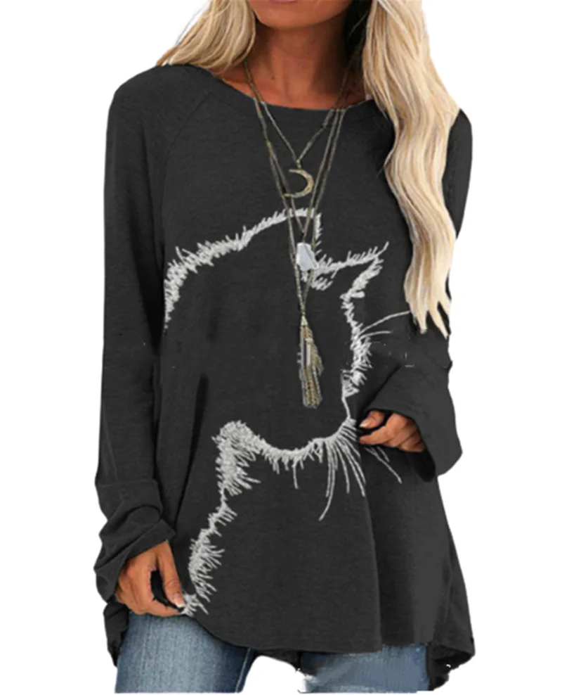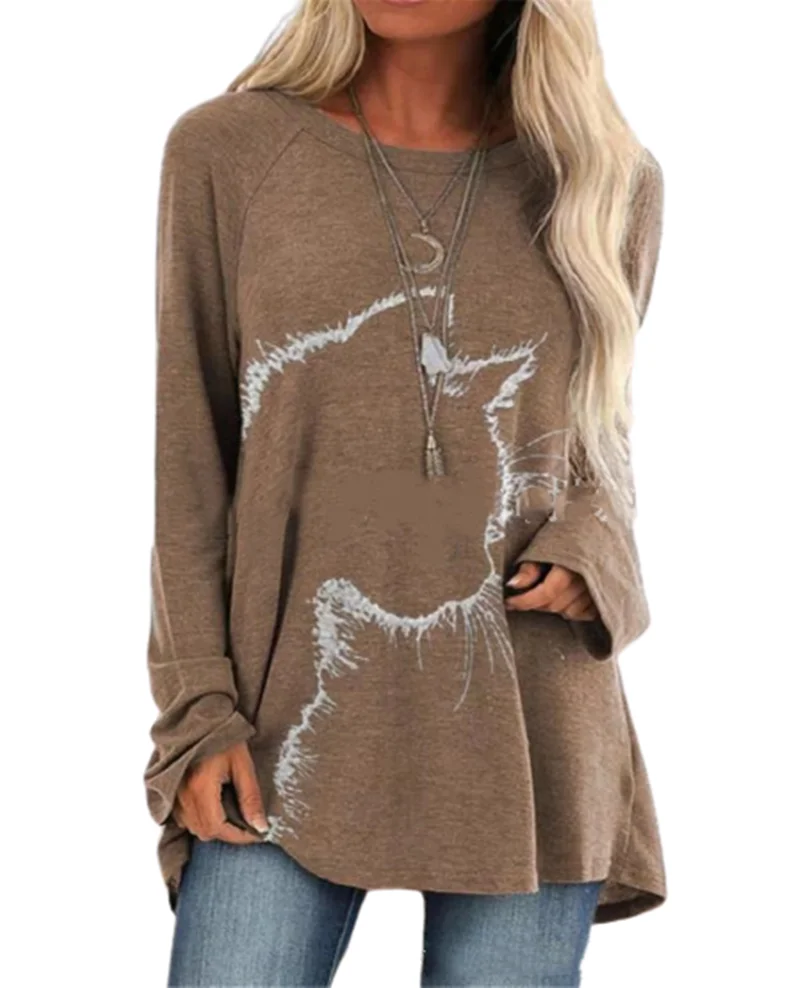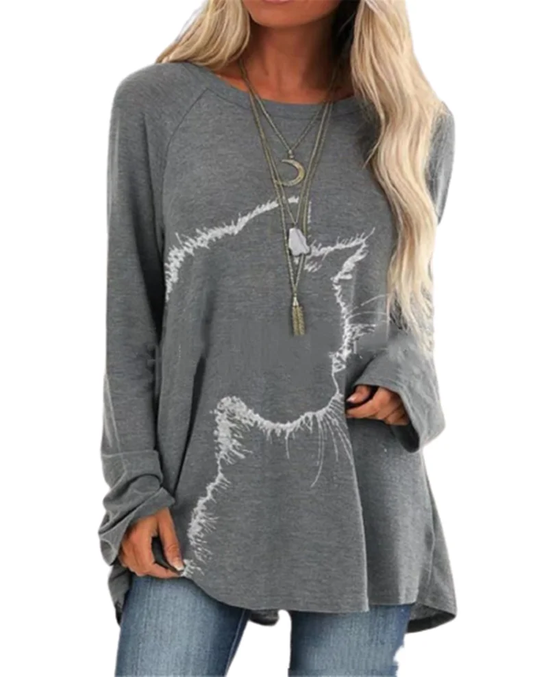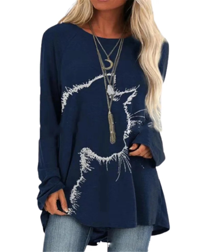 Dog Paw Print White Long T-shirts - Loose O-neck Long Sleeve Tops