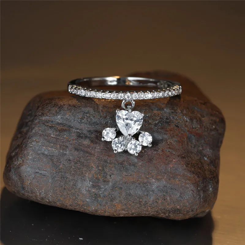 Vintage Gold Silver Color Animal Footprint Ring Cute Cat Paw Dog Claw Pendant Ring White Zircon Love Heart Stone Rings For Women