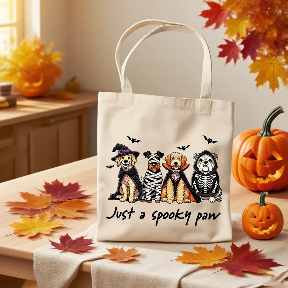 1.Adorable Halloween Dog Tote Bag: This 34x42cm Canvas Bag features four cute dogs dressed as a witch, mummy, vampire, and skeleton, with the playful "Just A Spooky Paw" phrase, making it a must-have for Halloween and a delightful Dog Lover Favor.