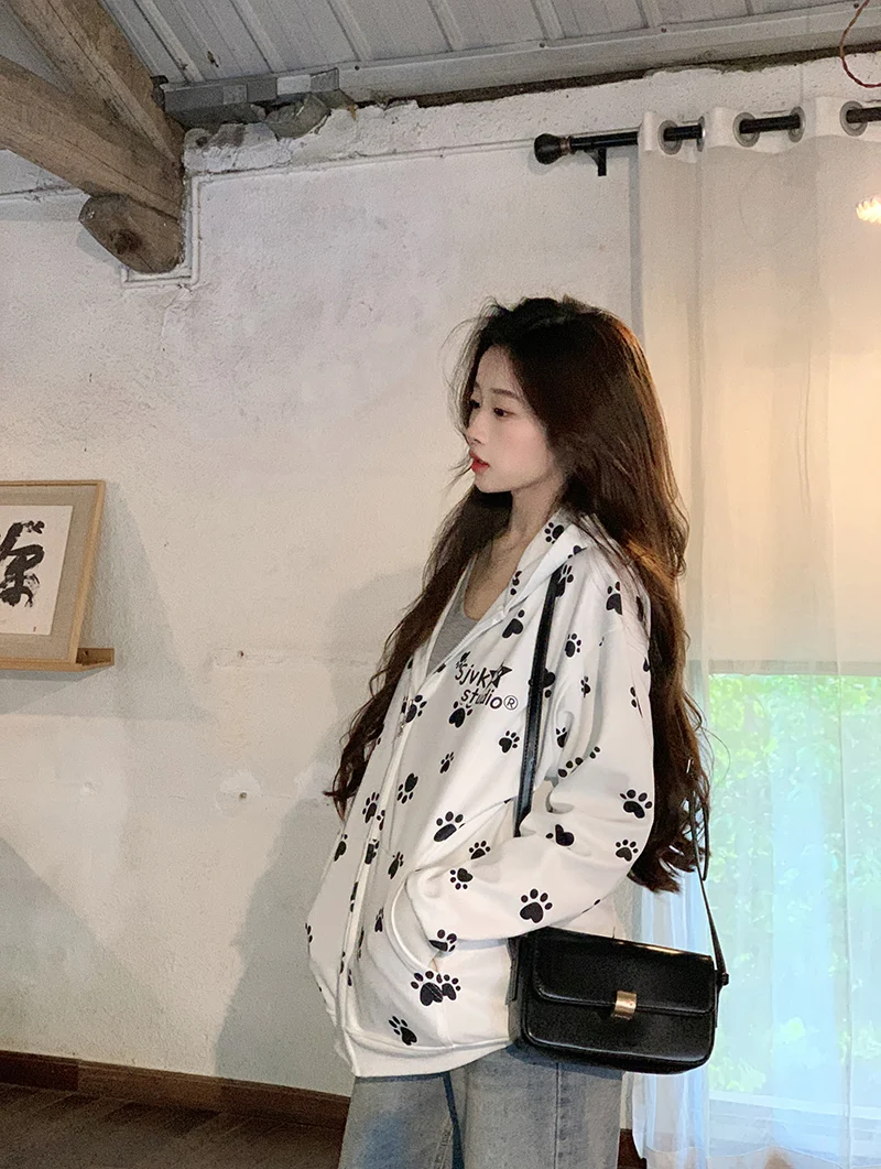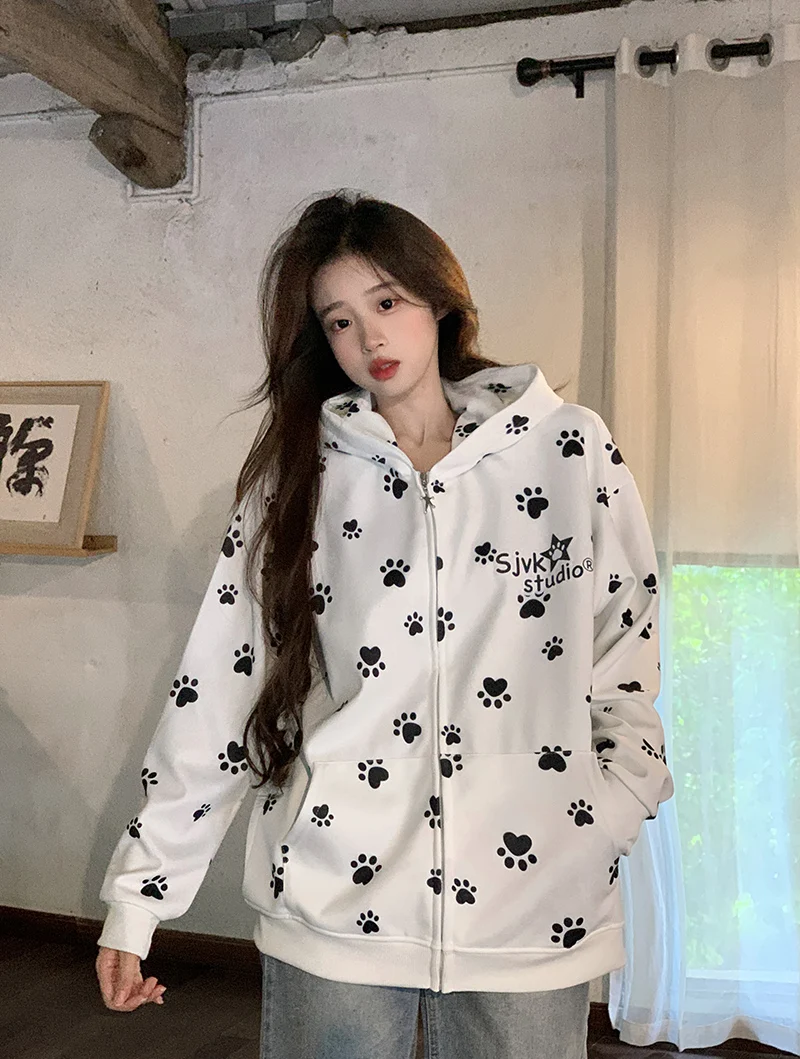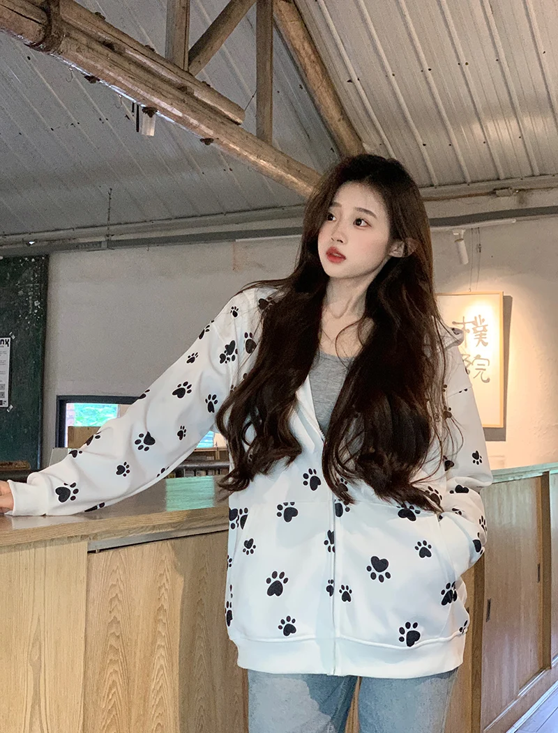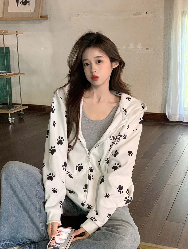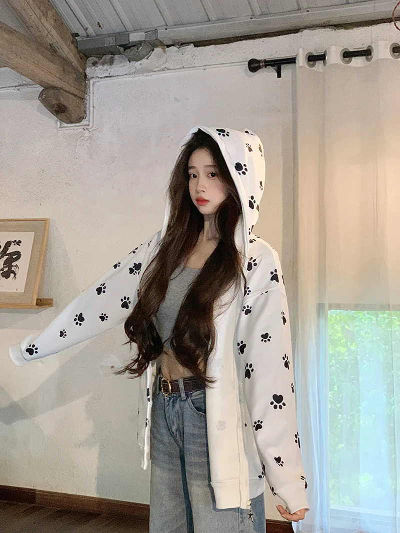 Many Cute Dog Paw Print Hooded Zippered Hoodies for Woman Spring and Autumn Fashion Trend Casual Comfy Sweet Thin Coat