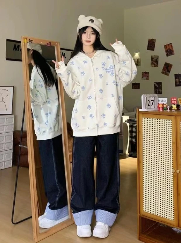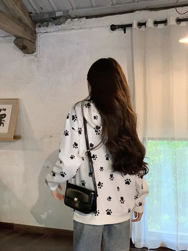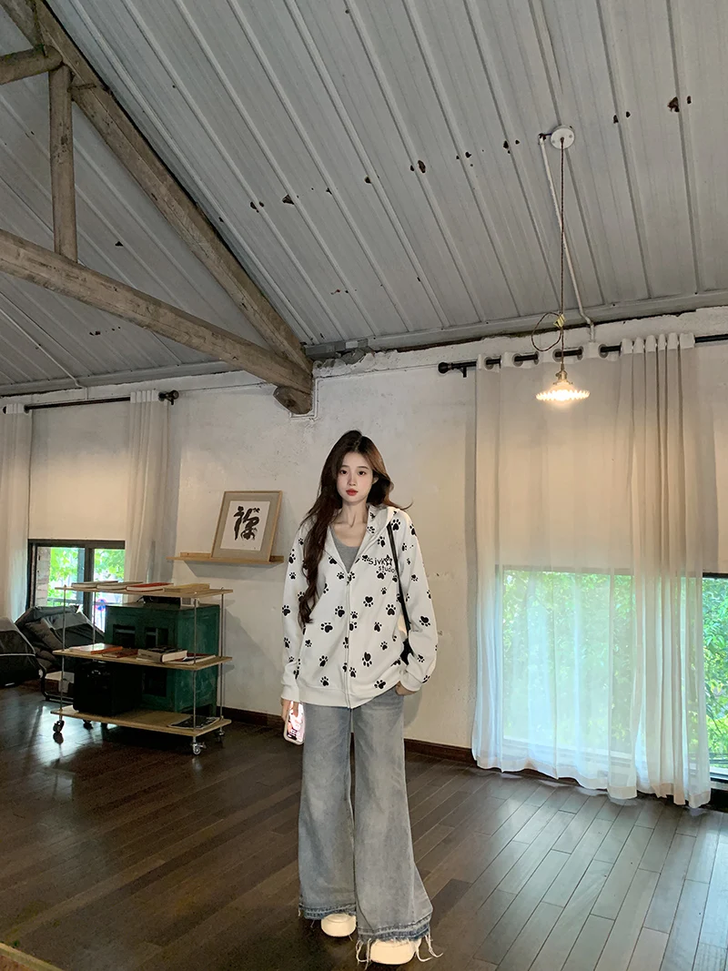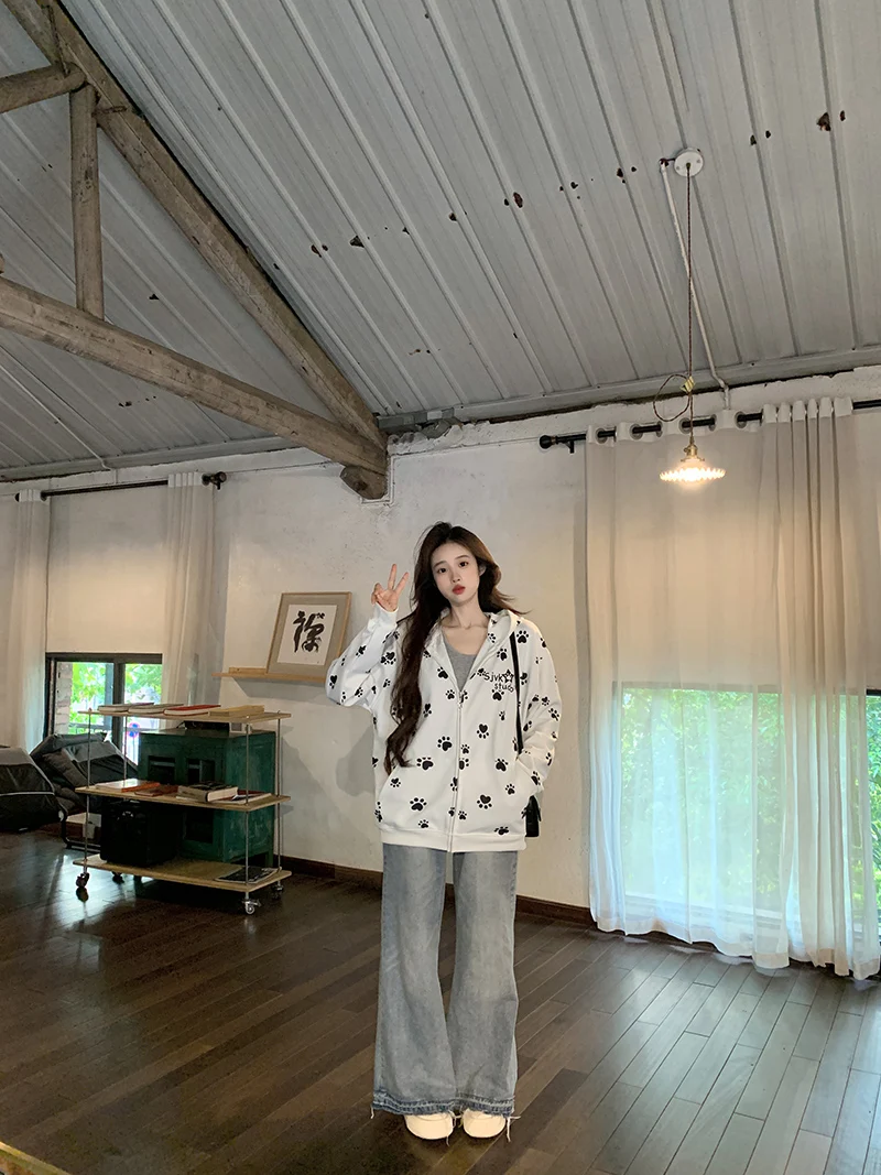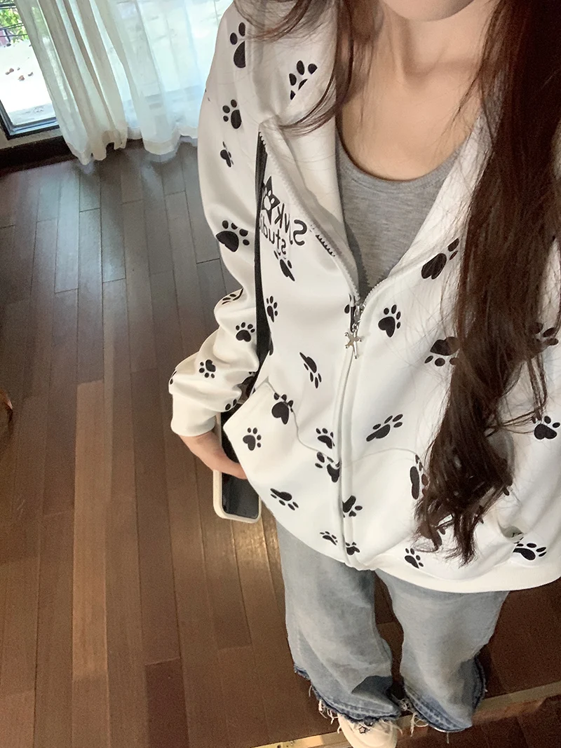 Many Cute Dog Paw Print Hooded Zippered Hoodies for Woman Spring and Autumn Fashion Trend Casual Comfy Sweet Thin Coat