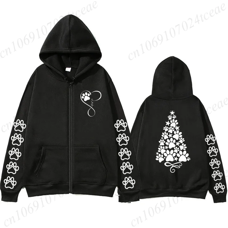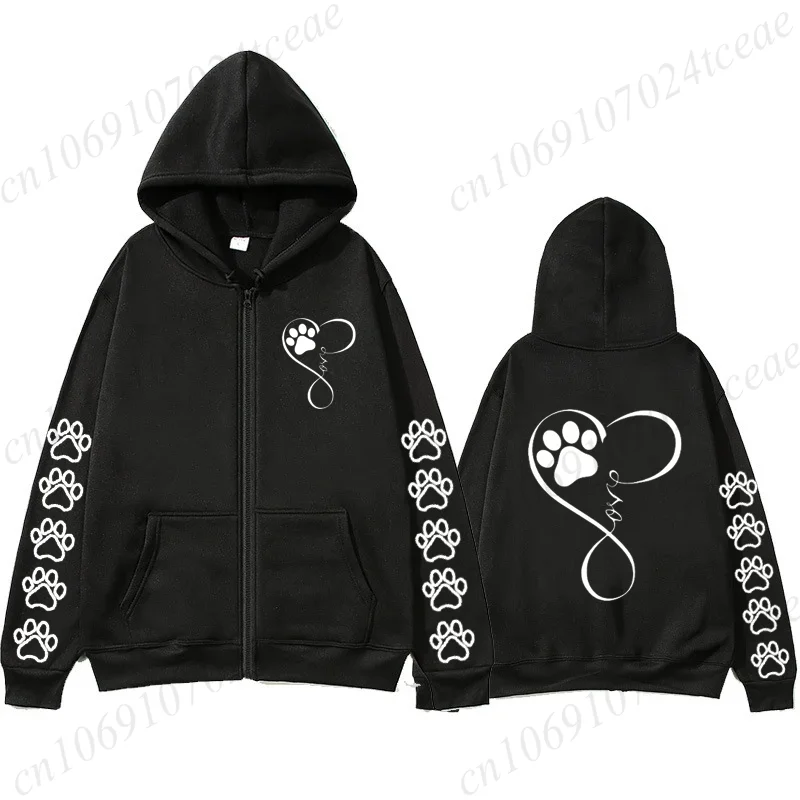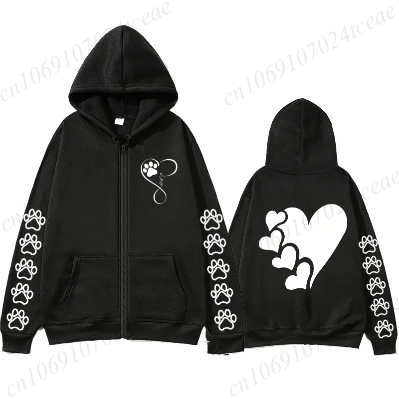 New Love Heart Dogs Paws Print Zip Up Hoodies Women Cartoon Sweatshirts Funny Black Hoodies Fashion Aesthetic Zipper Hoodies