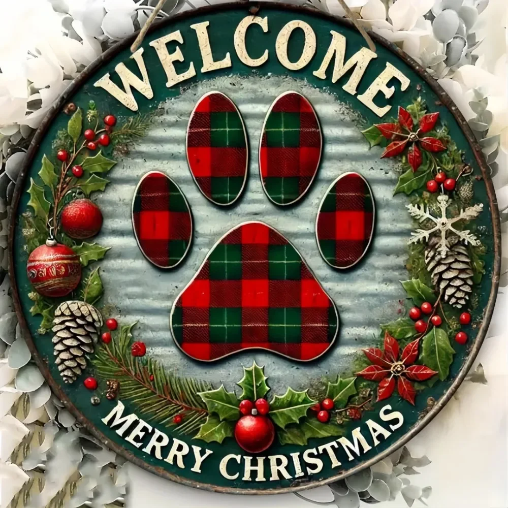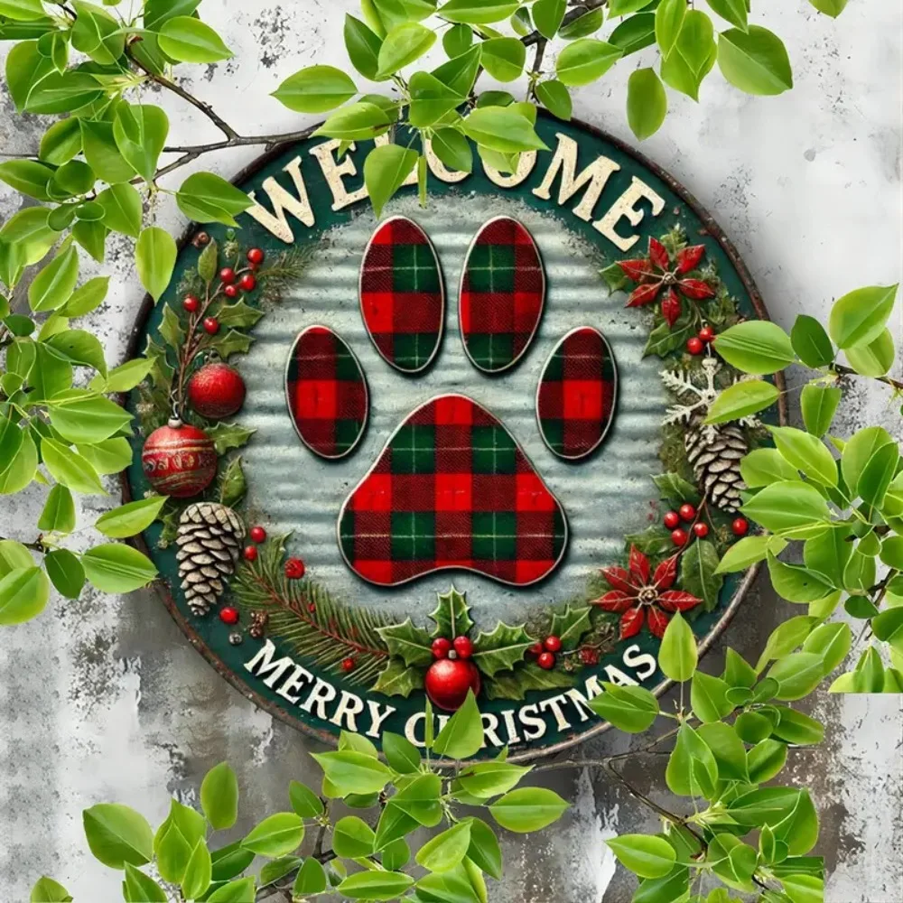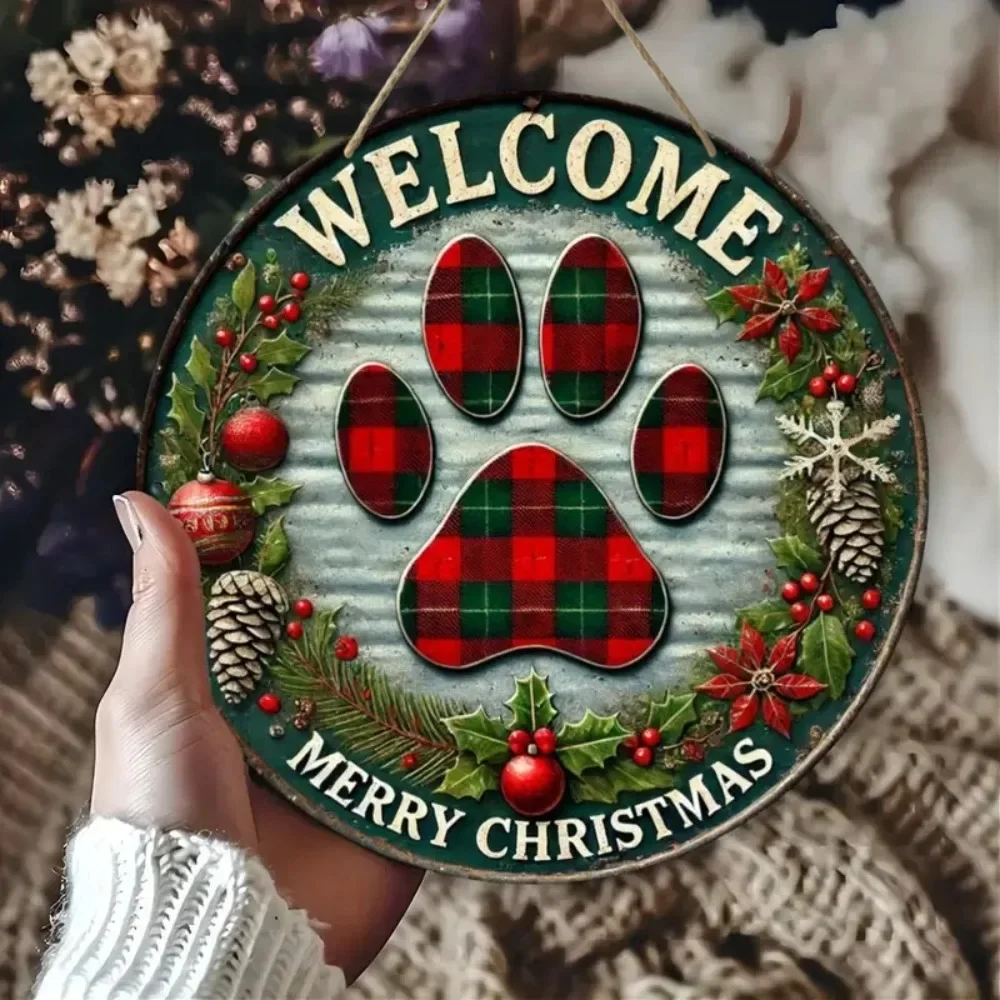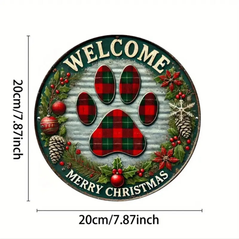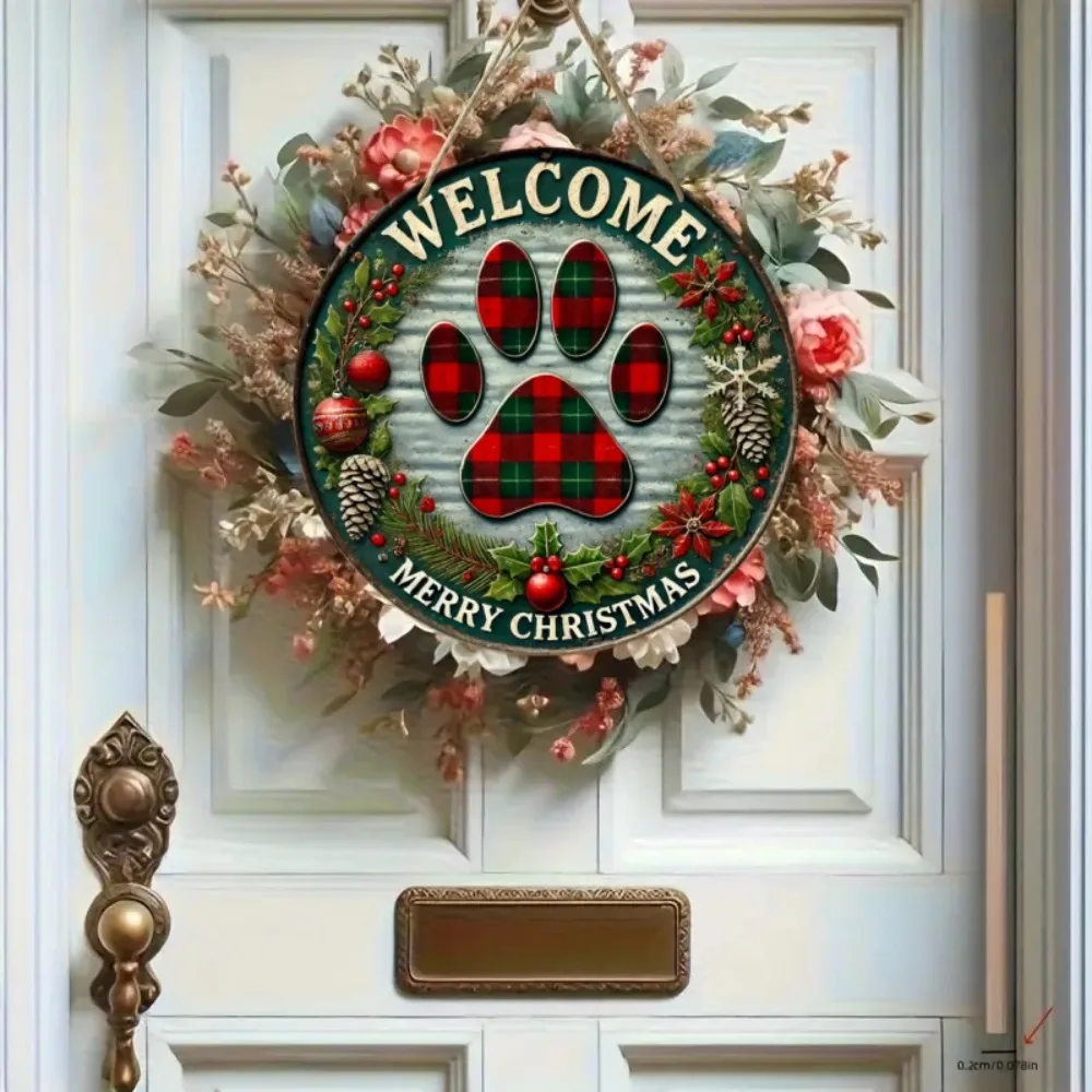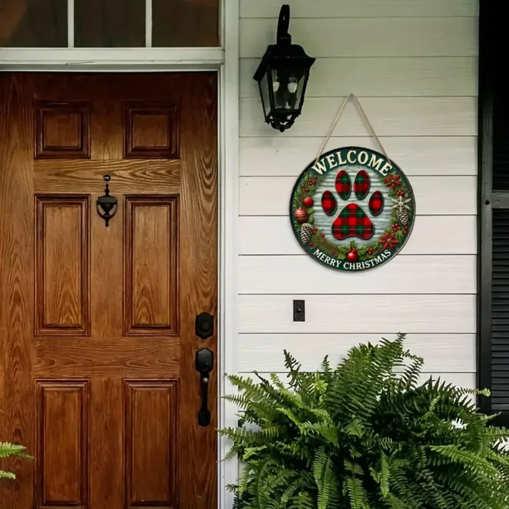 Retro Christmas Welcome Sign - Circular Wooden Hanging, Grid Claw Print Art Design, Suitable for Home, Bar, and Cafe Decoration